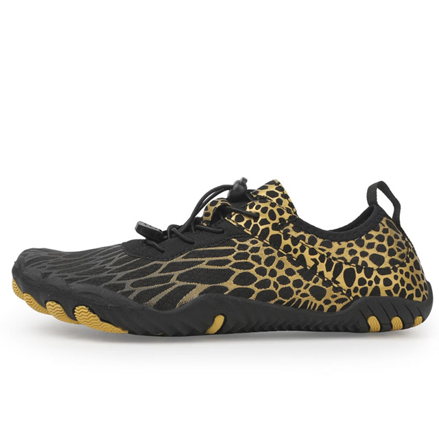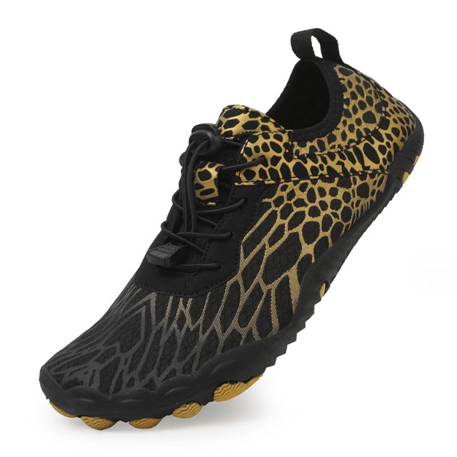 Dominate every aquatic and land challenge with our professional amphibious water shoes, designed for extreme outdoor performance. The durable, stretchable upper features a striking black-gold pattern, combining visual impact with practical functionality—its quick-dry fabric rapidly expels water and moisture, keeping feet dry during long hikes or water activities. The upgraded non-slip rubber outsole is carved with deep multi-directional lugs, delivering unbeatable traction on smooth wet rocks, muddy trails, and slippery riverbeds, effectively preventing slips and falls. With a secure elastic drawstring closure, the shoes lock in firmly and block sand, gravel, and debris from entering. The lightweight, barefoot-like construction reduces muscle fatigue, while the reinforced toe cap offers extra protection against sharp rocks and hard objects. Whether you’re crossing mountain streams, exploring coastal reefs, or engaging in kayaking and fishing, these shoes provide the perfect balance of protection, stability, and durability for adventurous explorers.